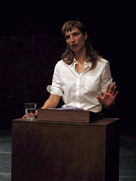 Would I vote for her? That’s the question I was asking myself, as I was leaving the theatre (Kaaitheater Studio’s, Brussels). Yes I would. Which was a strange answer, considering the fact that for the previous fifty minutes Kate McIntosh had been giving a speech that basically went nowhere at all. Or just one of the things that Although we fell short (written & directed by Tim Etchells) made me realize: strange how, if a politician has charisma, it doesn’t really matter what he or she is saying. Although we fell short premiered during Spoken World, a festival focusing on ‘the powers of speech’ (through December 12).